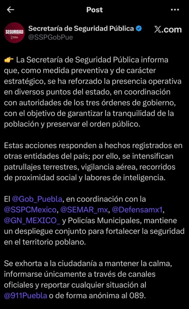 De acuerdo con información oficial, la medida tiene carácter preventivo y busca salvaguardar la integridad de la población poblana, así como mantener condiciones de orden y estabilidad. Para ello, se incrementó la presencia policial en puntos estratégicos del estado mediante acciones coordinadas entre autoridades federales, estatales y municipales.