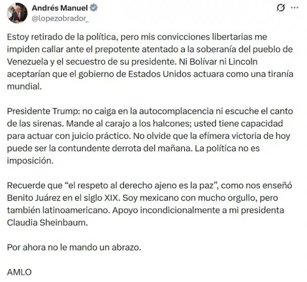 A través de su cuenta de X, AMLO se pronunció por el ataque del gobierno de Donald Trump a Venezuela y pidió al presidente de Estados Unidos no escuchar el canto de las sirenas.