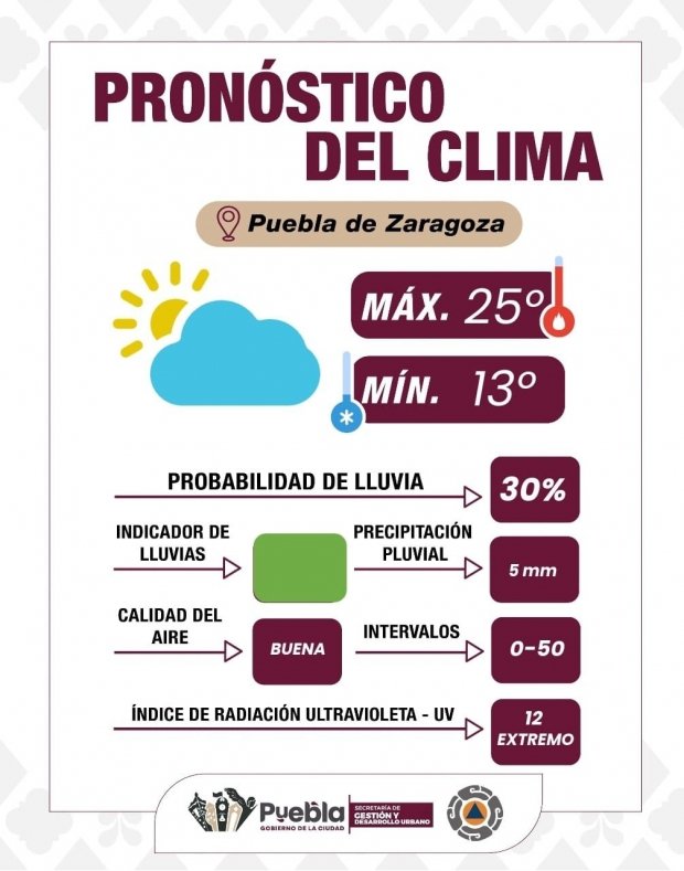 Puebla, Puebla., a 25 de agosto de 2025.- El Gobierno de la Ciudad de Puebla, a través de la Dirección de Gestión de Riesgos en materia de Protección Civil de la Secretaría de Gestión y Desarrollo Urbano, informa a la ciudadanía sobre las condiciones meteorológicas. Se anticipa un día parcialmente nublado, con baja probabilidad de lluvias aisladas por la tarde. De registrarse precipitaciones, se prevé una acumulación ligera entre 0 y 5 mm, por lo que se recomienda tomar precauciones, especialmente en zonas con problemas de escurrimiento pluvial.
