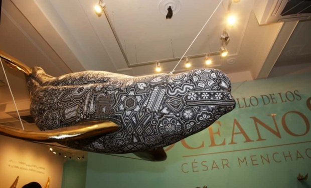 La exposición, inaugurada el pasado 17 de julio, fusiona el arte huichol con materiales contemporáneos y un poderoso mensaje ambiental. A través de esculturas monumentales decoradas con chaquira tradicional y plásticos recolectados en playas mexicanas, Menchaca invita a reflexionar sobre la urgencia de proteger los océanos.