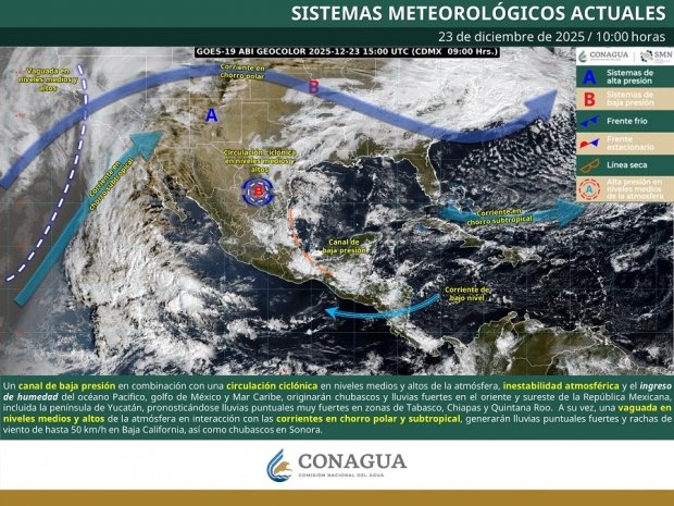 Este día, un canal de baja presión sobre el oriente y sureste del país, una circulación ciclónica en niveles medios y altos de la atmósfera sobre el noreste del territorio nacional, inestabilidad atmosférica sobre la península de Yucatán y el ingreso de humedad del océano Pacifico, golfo de México y mar Caribe, originarán chubascos y lluvias puntuales fuertes en las mencionadas regiones, así como en el centro y sur de México, pronosticándose lluvias puntuales muy fuertes en zonas de Tabasco (sur), Chiapas (norte) y Quintana Roo (norte y centro). A su vez, una vaguada en niveles medios y altos de la atmósfera en interacción con las corrientes en chorro polar y subtropical sobre el noroeste del territorio nacional, generarán lluvias puntuales fuertes y rachas de viento de hasta 60 km/h en Baja California. Finalmente, continuará tiempo estable y sin lluvia sobre entidades del norte y occidente del territorio nacional; además se mantendrá ambiente frío a muy frío durante la noche y madrugada sobre entidades de la Mesa del Norte y la Mesa Central.