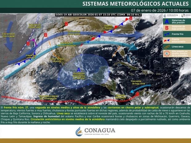 En el transcurso de este día, el frente frío núm. 27 se desplazará sobre el noroeste y norte del país, en combinación con una circulación ciclónica en niveles medios y altos de la atmosfera, además de las corrientes en chorro polar y subtropical, propiciarán intervalos de chubascos y vientos fuertes a muy fuertes en dichas regiones; con lluvias puntuales fuertes en Baja California, Sonora y Chihuahua, así como la caída de nieve o aguanieve en las sierras de los estados mencionados. Simultáneamente, una línea seca se establecerá sobre el noreste de México, ocasionando fuertes rachas de viento en Coahuila, Nuevo León y Tamaulipas. Asimismo, el ingreso de humedad del océano Pacífico y mar Caribe originará lluvias y chubascos en Guerrero, Oaxaca, Michoacán, Chiapas y Quintana Roo. Por otra parte, una circulación anticiclónica en niveles medios de la atmósfera mantendrá cielo despejado y baja probabilidad de lluvia en el resto de la República Mexicana. Finalmente, se mantendrá el ambiente frío a muy frío, con heladas y bancos de niebla matutinos en estados de la Mesa del Norte y la Mesa Central.