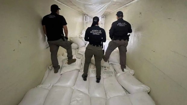 De acuerdo con la comunicación oficial, la droga venía oculta en la caja refrigerada de un tractocamión de la marca Volvo. Imágenes compartidas por la autoridad federal muestran decenas de costales de supuesto sulfato de amonio.