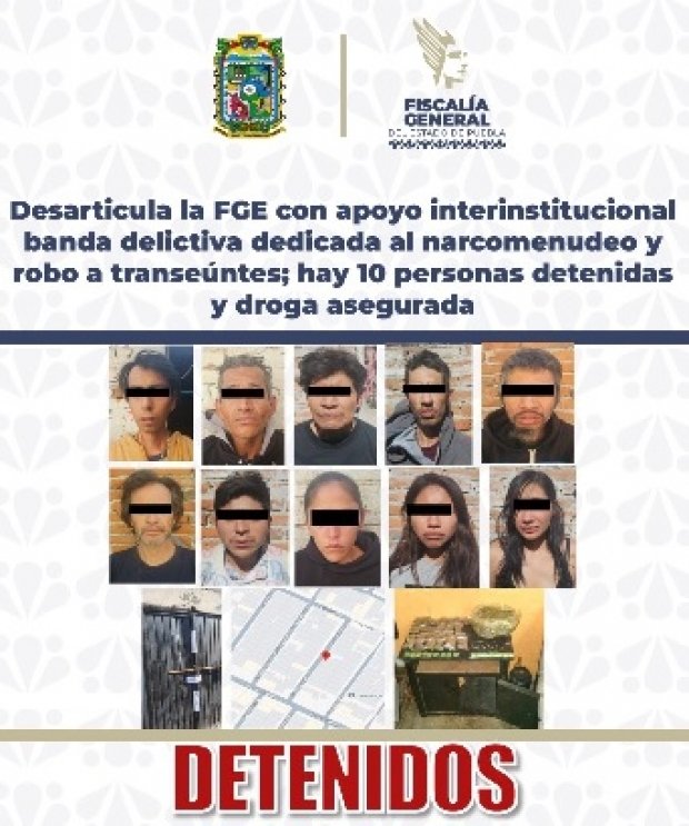 La Fiscalía General del Estado de Puebla (FGE), en coordinación con la Guardia Nacional (GN) y la Secretaría de Seguridad Pública Estatal (SSPE), desarticuló una banda delictiva dedicada al narcomenudeo y al robo a transeúntes que operaba al sur de la ciudad de Puebla. Como resultado de un cateo autorizado judicialmente, fueron detenidas 10 personas, siete hombres y tres mujeres, además del aseguramiento de diversas sustancias ilícitas.