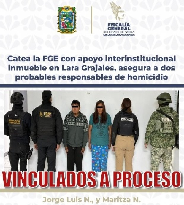 La Fiscalía General del Estado de Puebla informa que derivado de un homicidio ocurrido en el municipio de Rafael Lara Grajales, realizó un cateo en un inmueble de la región con apoyo interinstitucional de la Secretaría de la Defensa Nacional (DEFENSA) y de la Secretaría de Seguridad Pública del Estado (SSPE), logrando la detención de Jorge Luis N. y Maritza N., de 29 y 39 años de edad, respectivamente, como probables responsables del ilícito.
