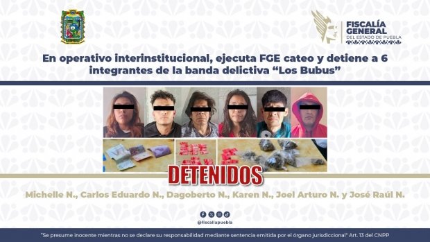 La Fiscalía General del Estado de Puebla (FGE) realizó un cateo que permitió la detención de seis personas presuntamente relacionadas con la venta y distribución de narcóticos en colonias y centros educativos ubicados al sur del municipio de Puebla.