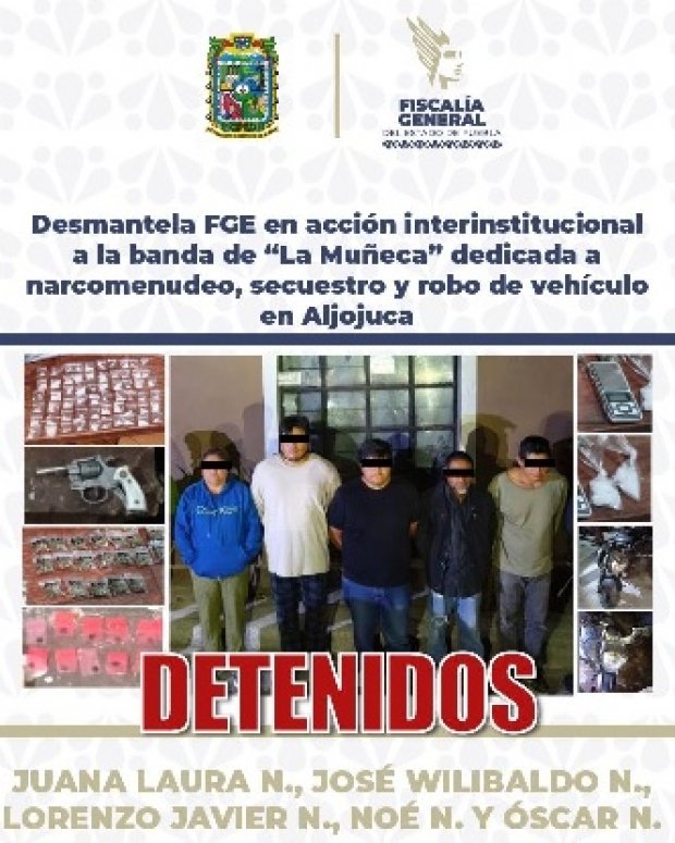 Como resultado de labores de inteligencia e investigación, la Fiscalía General del Estado de Puebla (FGE) desarticuló a un grupo delictivo identificado como “La Muñeca”, vinculado con actividades de narcomenudeo, secuestro y robo de vehículo en el municipio de Aljojuca, logrando la detención de cinco de sus integrantes y el aseguramiento de diversos indicios.