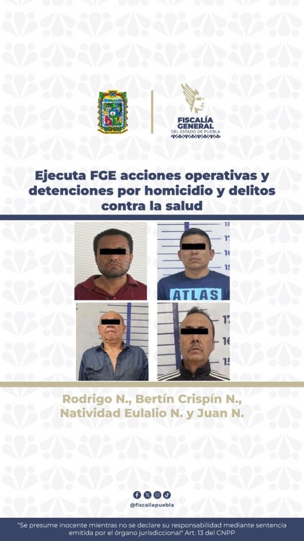 Como resultado de acciones de investigación y operativos en distintos municipios, la Fiscalía General del Estado de Puebla (FGE) realizó detenciones en flagrancia y cumplimentó órdenes de aprehensión por delitos de alto impacto, así como por delitos contra la salud.
