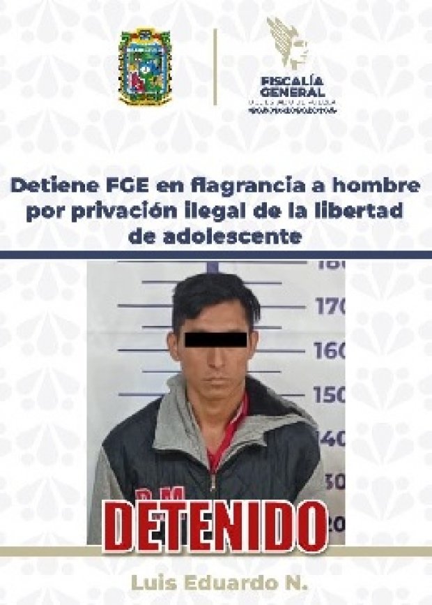 Como resultado de la intervención inmediata ante el reporte de familiares, la Fiscalía General del Estado de Puebla (FGE) detuvo en flagrancia a Luis Eduardo N., de 31 años, por su probable responsabilidad en el delito de privación ilegal de la libertad, en agravio de una adolescente.