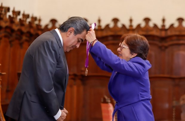 CIUDAD DE PUEBLA, Pue.- Por su invaluable apoyo a la educación y a la consolidación de Ciudad Universitaria 2, el gobernador Sergio Salomón recibió la Medalla “Melchor de Covarrubias” a la Filantropía Académica por parte de la Benemérita Universidad Autónoma de Puebla (BUAP), cuya rectora, Lilia Cedillo Ramírez reconoció al titular del Ejecutivo por garantizar la autonomía de la máxima casa de estudios.