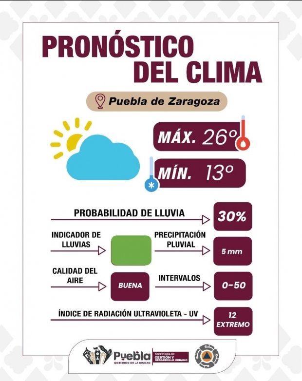Puebla, Pue., a 28 de agosto de 2025.- El Gobierno de la Ciudad, a través del Departamento de Alertamiento de Información de la Secretaría de Gestion y Desarrollo Urbano, informa a la población que se espera un día parcialmente nublado, con baja probabilidad de lluvias por la tarde y acumulaciones ligeras entre 0 y 5 mm. La temperatura se mantendrá entre los 14°C como mínima y los 26°C como máxima. La calidad del aire es buena, por lo que no se prevén riesgos para la salud de la población en general.