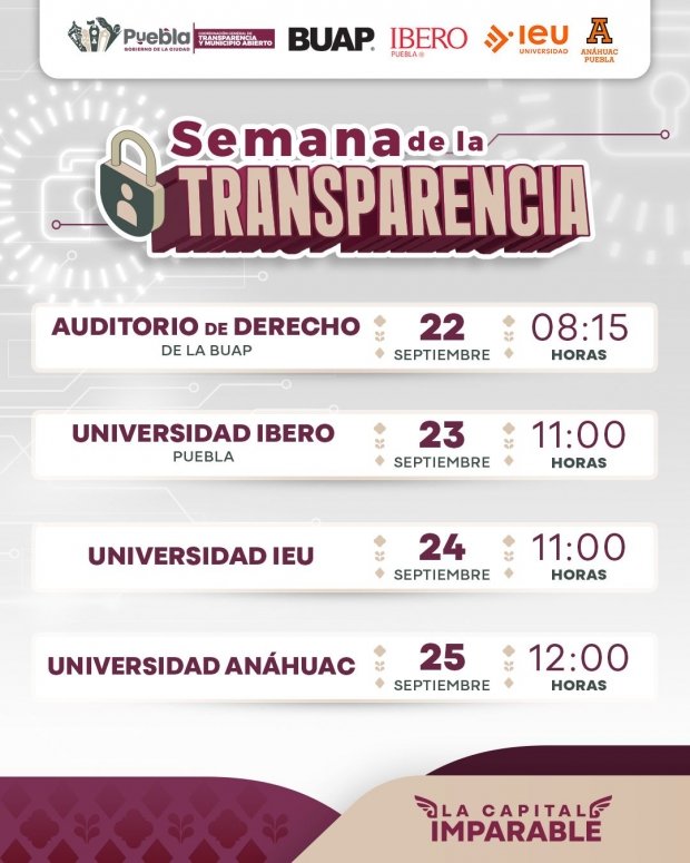 Puebla, Pue., 21 de septiembre de 2025.- El Gobierno de la Ciudad que encabeza el presidente municipal, Pepe Chedraui Budib, promoverá una semana de la Transparencia del 22 al 25 de este mes, con un programa de actividades dirigido a estudiantes universitarios, con el objetivo de fortalecer la cultura de la rendición de cuentas, el cuidado de los datos personales y la prevención de la violencia digital.