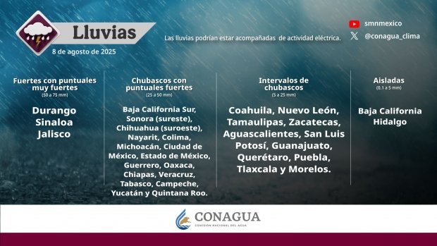 Pronóstico de lluvias para hoy 08 de agosto de 2025: