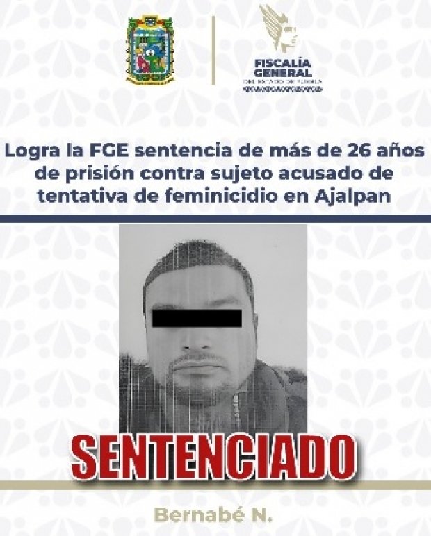 Como resultado de los argumentos presentados por la Fiscalía General del Estado de Puebla, se logró una sentencia de 26 años, 8 meses de prisión contra Bernabé N., acusado de feminicidio en grado de tentativa, ocurrido en Ajalpan.