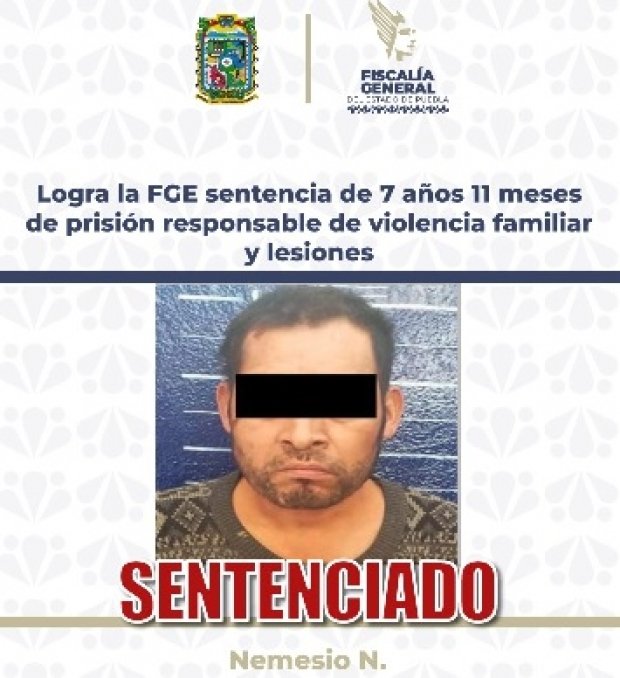 Como resultado de la aportación de pruebas fehacientes, la Fiscalía General del Estado de Puebla, obtuvo sentencia de 7 años, 11 meses de prisión en contra de Nemesio N., acusado de violencia familiar y lesiones.