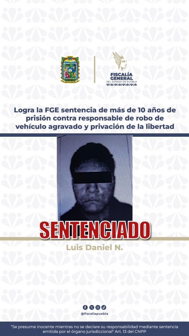 a Fiscalía General del Estado de Puebla obtuvo una sentencia superior a 10 años de prisión en contra de Luis Daniel N., declarado penalmente responsable de los delitos de robo de vehículo agravado y privación ilegal de la libertad.